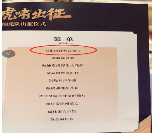 最后宏遠出征儀式上的菜單,第一道菜就讓大家都知道廣東還是記著和老對手遼籃的恩怨的:“石斛肉汁燉遼參仔”。相信一些廣東球迷都看出來了這道菜是在說誰。不過菜單沒有“番薯糖水”就有點可惜。可能是朱芳雨做的菜單,杜鋒看過之后把這道甜品給刪掉了。