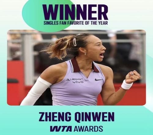 中國網球選手鄭欽文連續第二年獲得WTA最受歡迎球員。